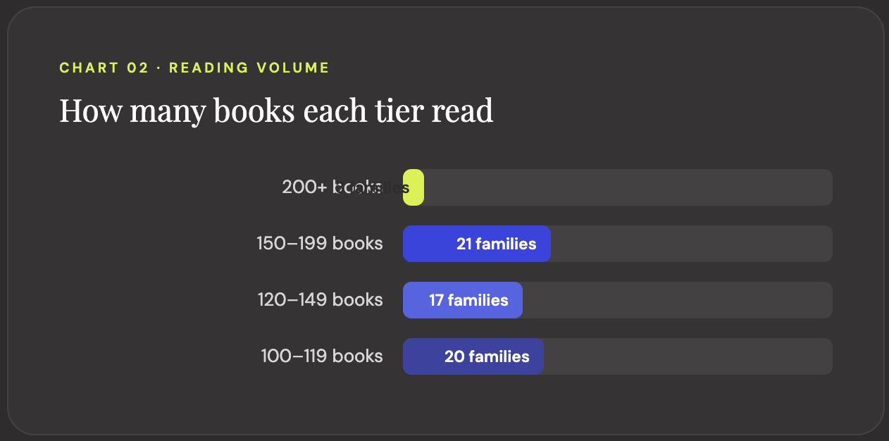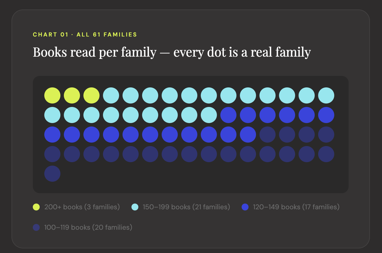 Sixty-two families finished 100 books this year. Not all of them had children who woke up loving reading. Some fought it at first. Some needed three months to find the right genre. One parent told us her daughter reads only for entertainment, and they're worried she's not getting enough information.