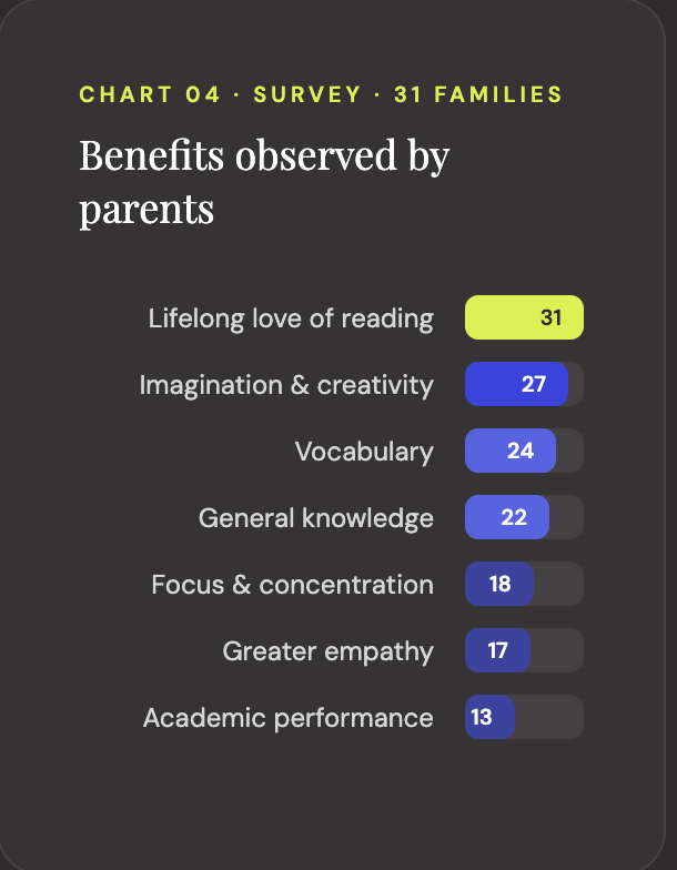 I expected the predictable stuff: "vocabulary improved," "reads faster now," "likes chapter books." Those came in, sure. Every single respondent — all 31 — said their child developed a lifelong love for reading. But that wasn't the interesting part.