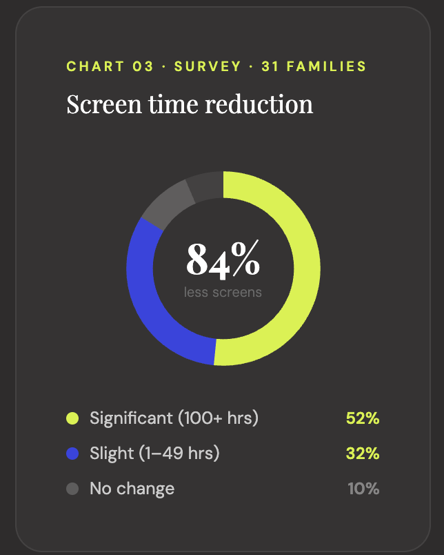 87% of families reported reduced screen time - 16 of them said the reduction was significant (more than 100 hours across the year). Only 3 families saw no change. And nearly half the children were reading more than 60 minutes a day by the end of the challenge. Not because they were forced to. Because they wanted to.