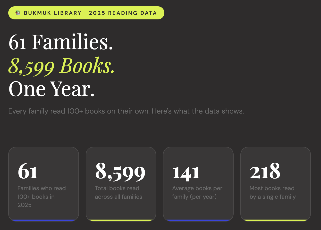 So this year, I pulled the actual numbers from our library database. Sixty-one families read more than 100 books each in 2025 — on their own, without a formal challenge, without prizes. They just kept coming back for more books. Together they read 8,599 books. The average across all 61 families was 141 books per child. Three families crossed 200. The highest was 218.